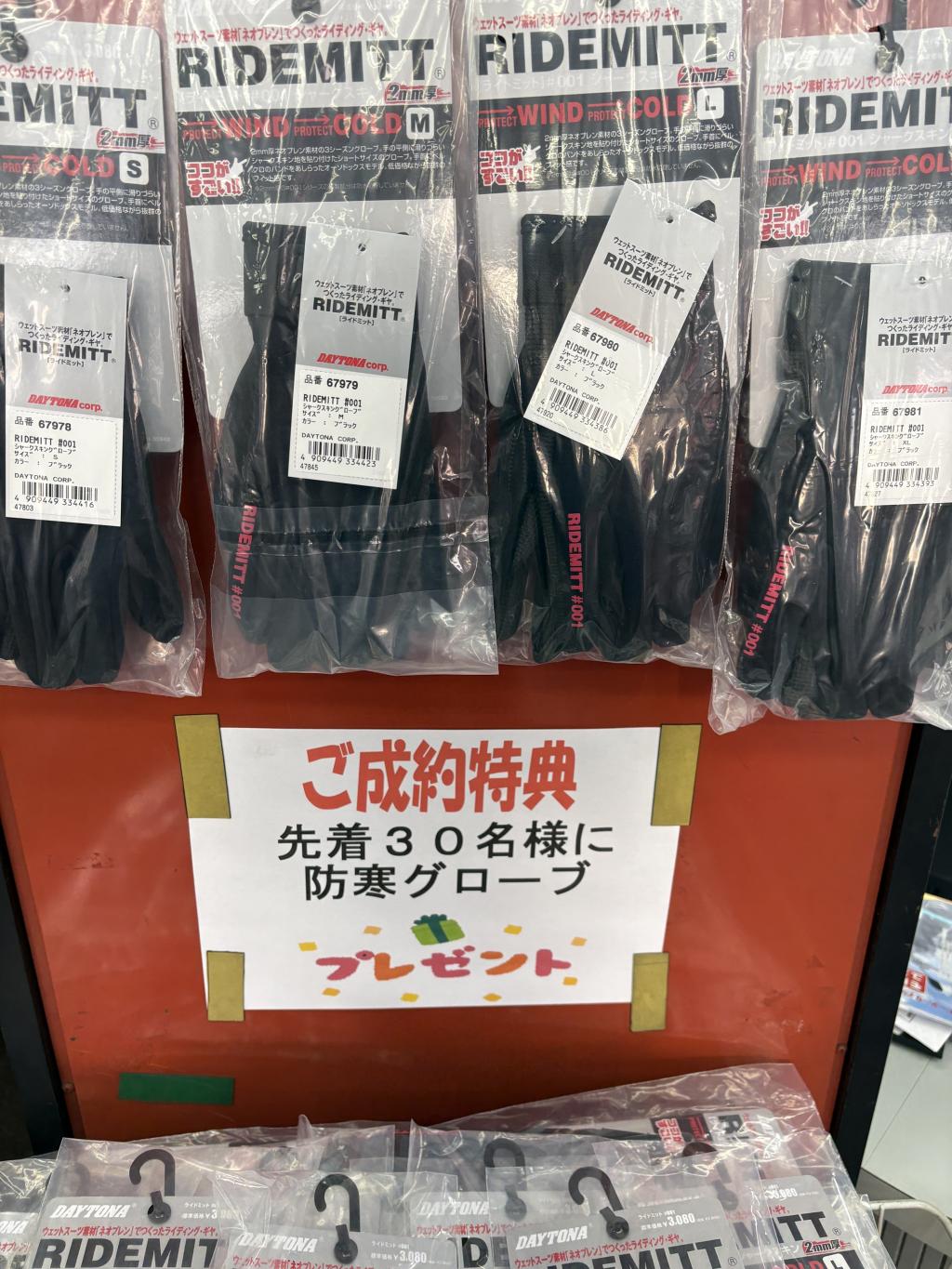 ご成約プレゼントをご用意いたしました! 先着30名様とはなりますが・・・ ネオプレーン素材の防寒グローブです! この冬は冬らしい冬の気温らしいです、しっかり防寒して快適なバイクライフを!